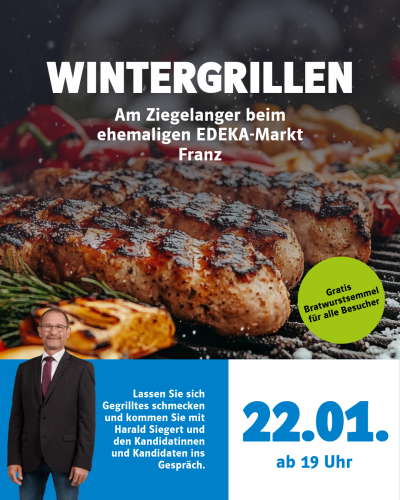 Die CSU Tirschenreuth lädt herzlich ein zu unserem Wintergrillen. Es ist die perfekte Gelegenheit, in entspannter Atmosphäre zusammenzukommen, sich aufzuwärmen und über das zu quatschen, was dich in unserer Stadt bewegt.