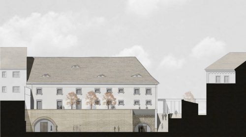 Bislang sahen die Pläne in dem Bereich drei ebenerdige Zugänge vom ehemaligen Parkplatz zum Kellergeschoss vor. Eine Mauer sollte diesen Zugangsbereich umgeben, das "Dach" wäre Boden für eine Terrasse, den sogenannten Hochschulgarten. Jetzt kommt es anders, wie Architekt Peter Brückner dem Stadtrat aufzeigte. Die alte Mauer wird mit als Tragwerk für den Hochschulgarten genutzt. Der rechte Kellerzugang bleibt komplett frei. Der Bereich unter dem Hochschulgarten kann über einen weiteren Zugang (links) betreten werden. So können etwa bei Führungen, die alten Mauern genauer in Augenschein genommen werden. Vom Hochschulgarten führt dann eine kleine Brücke nach rechts über den offenen Kellerzugang und zur Treppenanlage."Wir wollen Geschichte sichtbar machen", beschrieb Peter Brückner die Absicht. Bei den Kosten geht man weiter von rund 1,5 Millionen Euro für die Außenanlagen und etwa 2,5 Millionen Euro für das Gebäude aus. Genaue Zahlen…