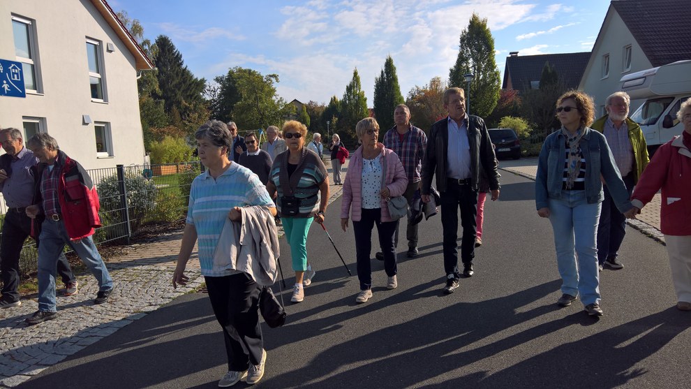 Bei strahlendem Herbstwetter folgte ein äußerst angenehmer Spaziergang durch das Neubaugebiet Büttelloch. Zunächst schlendern die Senioren unter Führung von Norbert Schuller über die Spannbandbrücke, den Büttellochweg entlang, weiter durch die Friedrichstraße. Unterhaltsame Erzählungen Schullers über seine Erlebnisse als Postbote amüsierten die Teilnehmer. In dieser entspannten Atmosphäre war es ein Leichtes untereinander mit bis dahin unbekannten Menschen ins Gespräch zu kommen. Rosemarie Kolditz, die sich ebenfalls in den ehrenamtlichen Dienst von "Leben Plus" gestellt hat, hakte sich gerne bei Bedarf unter und unterstützte beim Laufen. Sogar Erfrischungsgetränke bekamen die Teilnehmer von erfreuten Anwohnern angeboten, als sie Schuller mit der Gruppe erblickten. Dieser führte die Teilnehmer dann über die Martin-Luther-Straße wieder zurück in den Fischhofpark. Der erste Stadtteilspaziergang fand einen gelungenen Ausklang auf der Seeterrasse bei einer duftenden Tasse Kaffee oder einem Bierchen.