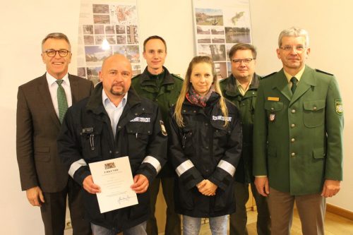 Seit der Einrichtung der Sicherheitswacht in Tirschenreuth vor über 15 Jahren ist Harald Wagner im Stadtgebiet auf Fußstreife im Dienste der Allgemeinheit unterwegs. Dafür erhielt er durch den Leiter der Polizeiinspektion Tirschenreuth, Ersten Polizeihauptkommissar Werner Schönfelder, eine Dankesurkunde des Bayerischen Staatsministers Joachim Herrmann überreicht.