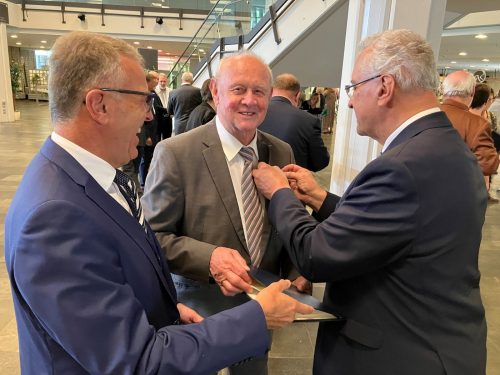 Der Bayerische Ministerpräsident Dr. Markus Söder hat Horst Adler das Ehrenzeichen des Bayerischen Ministerpräsidenten für Verdienste im Ehrenamt verliehen. Mit der Auszeichnung wurde das jahrzehntelange Engagement des Tirschenreuthers für die Aussöhnung zwischen Deutschen und Tschechen gewürdigt. Das Ehrenzeichen wurde am Montag dieser Woche im Rahmen einer Festveranstaltung in Erlangen von Joachim Herrmann, Bayerischer Staatsminister des Innern, für Sport und Integration, überreicht. Neben dem Staatsminister gratulierte auch Bürgermeister Franz Stahl herzlich zu der hohen Auszeichnung.