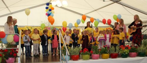 In dem Städtischen Kindergarten werden heute drei Kinderkrippengruppen mit 26 Kindern und vier Kindergartengruppen mit 90 Kindern bereut. Aktuell kümmern sich 25 feste Mitarbeiterinnen und zwei Berufspraktikantinnen um das Wohl der Kleinsten. Und die ruft Kindergartenleiterin Silvia Markowski nach ihrer Begrüßung gern zu sich auf die Bühne: Sie ist sichtlich stolz auf das Kinderhaus und ihr Team. Das Motto hier: Einer für alle, alle für einen. „Wir sind – Achtung Wortmischung – Frolleginnen: Kollegen und Freundinnen“, so Markowski freundestrahlend.