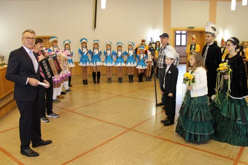 Mit "Helau" zog die Faschingsgesellschaft, angeführt von Alleinunterhalter Walter Kobel, lautstark ins Rathaus ein. Im Saal verlas Ehrenhofmarschall Günter Fennerl die Inthronisation, "die Macht muss her, der Schlüssel raus, es herrscht die Tursiana in diesem Haus". Weiter sagte er, "die Monarchie hat Einzug gehalten, das neue Prinzenpaar wird schalten und walten. Prinz Christian und Prinzessin Svenja regieren nun, es gibt weiß Gott noch viel zu tun". An Bürgermeister Franz Stahl gewandt, sagte er, "schön war's euch heute hier zu sehen, doch nach der Inthronisation könnt ihr in Urlaub gehen. Am Aschermittwoch könnt ihr zurück an die Macht, bis dahin die Tursiana über das Rathaus wacht".