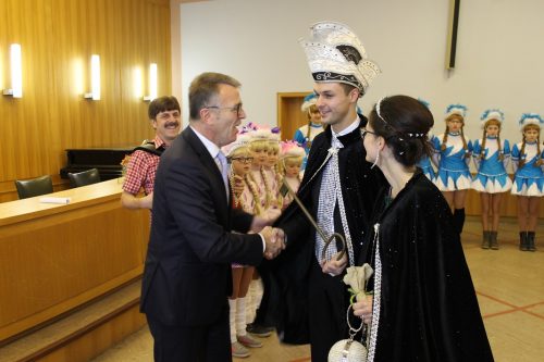 Mit "Helau" zog die Faschingsgesellschaft, angeführt von Alleinunterhalter Walter Kobel, lautstark ins Rathaus ein. Im Saal verlas Ehrenhofmarschall Günter Fennerl die Inthronisation, "die Macht muss her, der Schlüssel raus, es herrscht die Tursiana in diesem Haus". Weiter sagte er, "die Monarchie hat Einzug gehalten, das neue Prinzenpaar wird schalten und walten. Prinz Christian und Prinzessin Svenja regieren nun, es gibt weiß Gott noch viel zu tun". An Bürgermeister Franz Stahl gewandt, sagte er, "schön war's euch heute hier zu sehen, doch nach der Inthronisation könnt ihr in Urlaub gehen. Am Aschermittwoch könnt ihr zurück an die Macht, bis dahin die Tursiana über das Rathaus wacht".